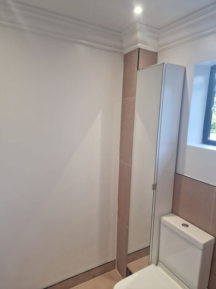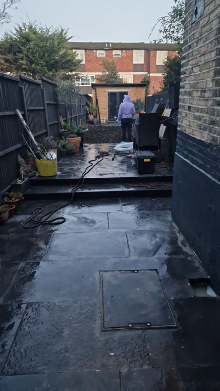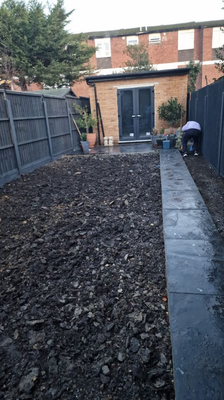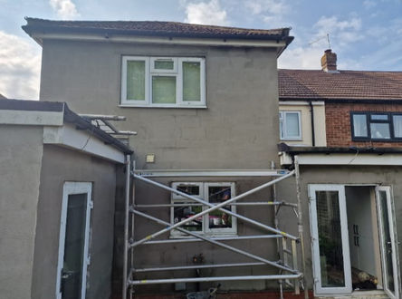Full house refurbishment - remove old exterior renderings, enforcement of wall surfaces, rendering the walls and applying decorative silicon paint on them. The garden work was carried out on the pation, which involve removing the entire patio and restoring new materials including a solid base. The grass are was also removed, the soil was improved and replaced with new grass.